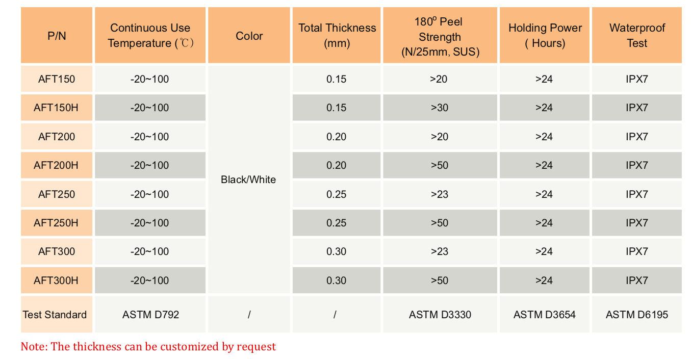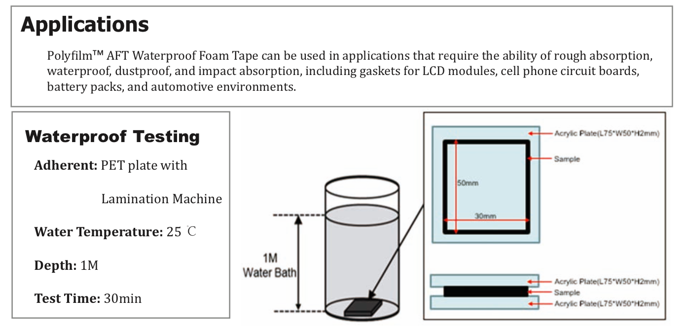 TM AFT 系列防水泡棉膠帶是一種雙面膠帶,由丙烯酸泡棉和丙烯酸粘合劑組成。這種防水泡棉帶由于其微觀和獨立的細胞結構而非常薄和柔軟。它具有高沖擊吸收、優異的防水性能、良好的防塵性能和回彈性。" />